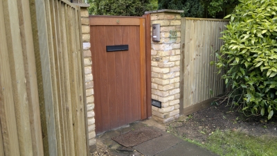 The primrose hardwood gate design. This installation is operated as a sliding gate on a floor mounted track. The gate itself is made from Sapele Hardwood and manufactured in one length with a 70mm frame. The gate automation fitted is the Saturn 600 gate kit along with additional photo cells and safety edges. We also installed a pedestrian gate to the front of the house with a self closing gas strut, mag lock, code pad for exit and the Daitem wireless intercom system. The brick piers with the lights built in were erected by us. The lights operate when both gates are open or they can be over ridden by the on and off switch to allow the lights to stay on permanently. The intercom handset also allowed the customer to open the driveway gate as well as the pedestrian gate although the intercom system was installed at the pedestrian gate. The fencing was supplied and installed by ourselves and stained after completing the project. We also fitted a flex receiver to the garage motors so the customer had one remote to open the gates and garage door.